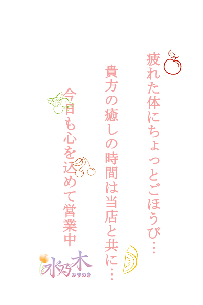 私たちはそんな日々お疲れの貴方様に尽くし、疲れを取り除くべく日々腕に磨きをかけております!!当店自慢のマッサージ技術で是非、気持ち良くなっていただければ幸いでございますそれが私たちの喜びです!
